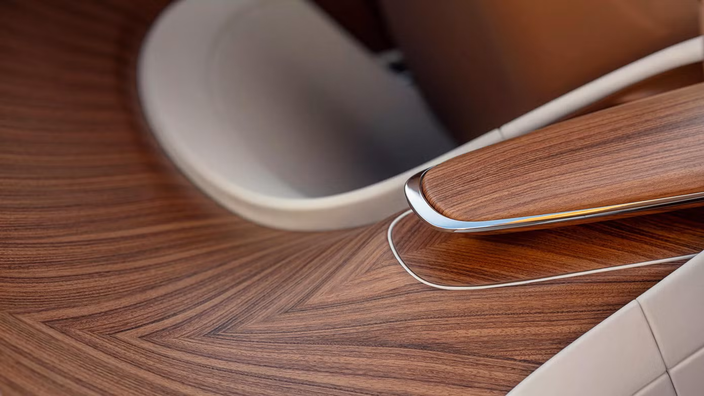 Màu chủ đạo của nội thất trên Arcadia Droptail là trắng kết hợp hài hòa với màu nâu bespoke cho phần ngoài của ghế ngồi và tựa đầu. Viền gỗ bao quanh khoang cabin, trải dài từ bảng táp-lô, ốp cửa đến phần cong sau ghế.