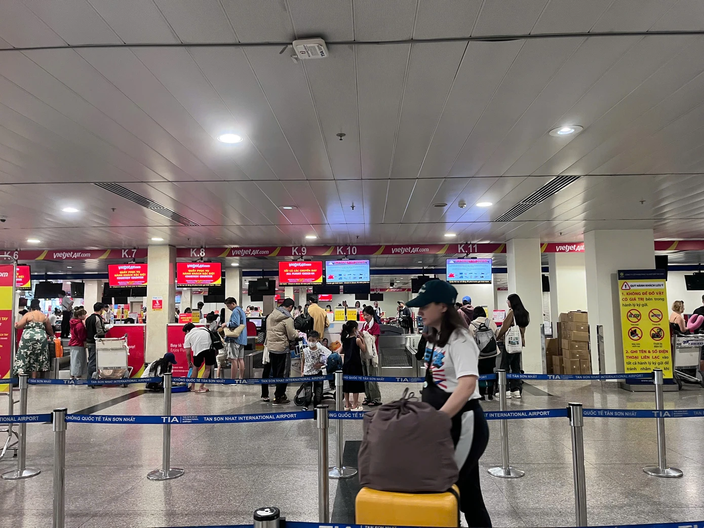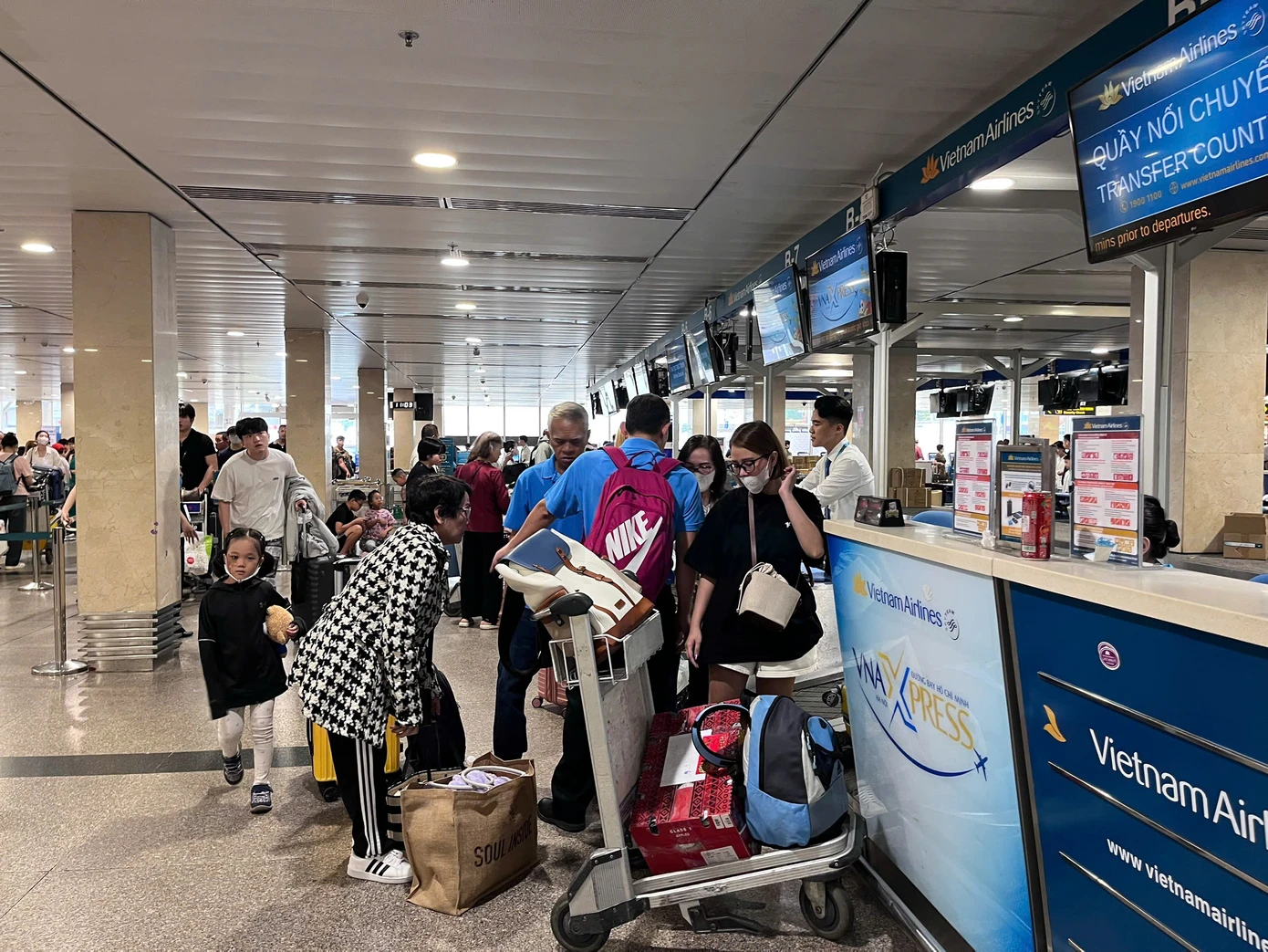 | Ghi nhận của PV Báo Tiền Phong cho thấy khu vực ga đến quốc nội sân bay Tân Sơn Nhất nhộn nhịp khách. Theo kế hoạch phân bổ slot (lượt cất hạ cánh) của sân bay này, nhiều khung giờ cao điểm lên tới 50 chuyến bay/giờ. |