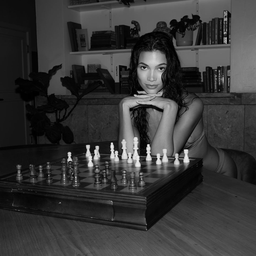 Người đẹp mặc bikini chơi cờ trong nhà.