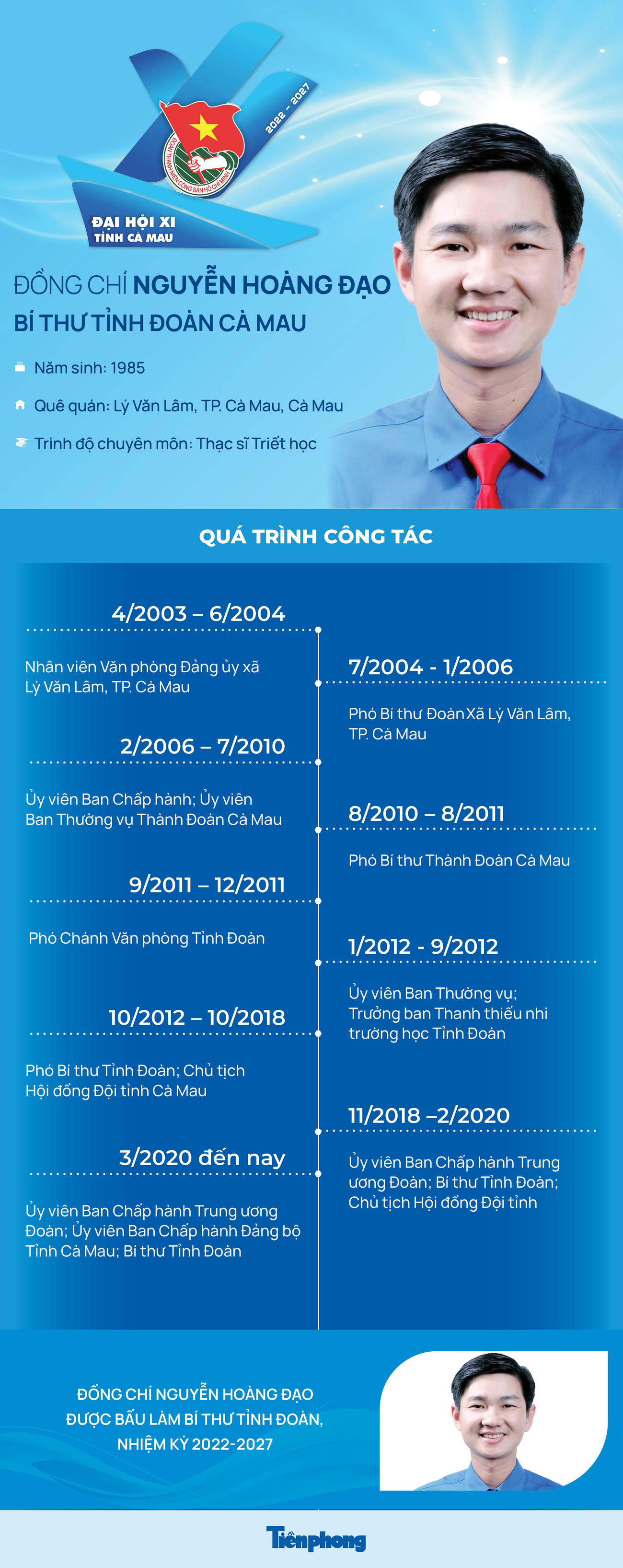 TPO - Tại phiên họp thứ nhất Ban Chấp hành Đoàn TNCS Hồ Chí Minh tỉnh Cà Mau, nhiệm kỳ 2022 – 2027, anh Nguyễn Hoàng Đạo - Bí thư Tỉnh Đoàn Cà Mau khóa X, nhiệm kỳ 2017 - 2022, được tín nhiệm bầu làm Bí thư Tỉnh Đoàn khóa XI, nhiệm kỳ 2022 – 2027. Anh Nguyễn Ngọc Thuận và anh Trần Đăng Khoa được tín nhiệm bầu làm Phó Bí thư Tỉnh Đoàn khóa XI.