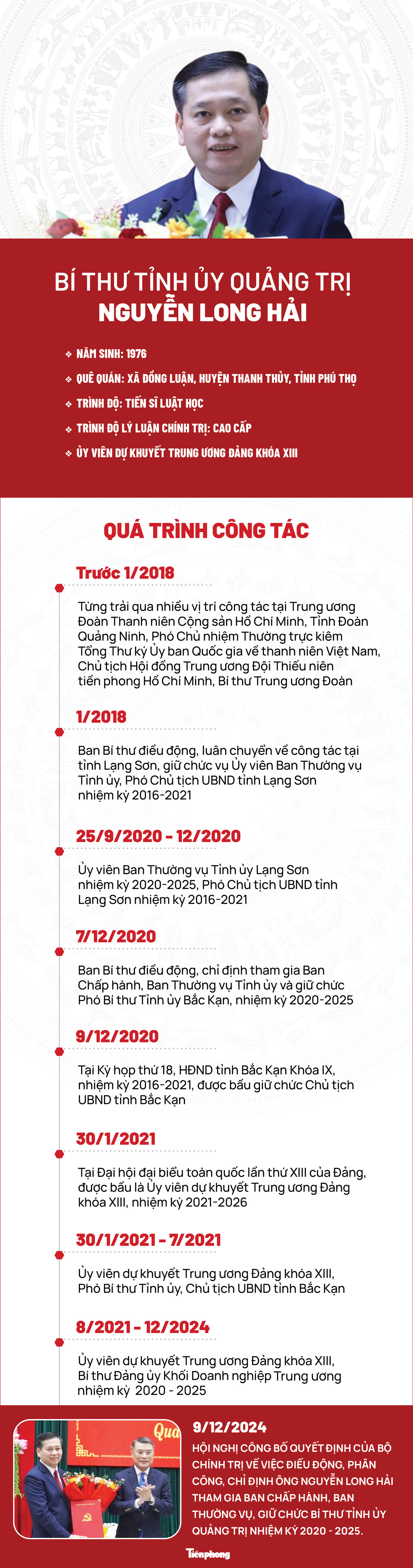 TPO - Bộ Chính trị điều động, phân công, chỉ định ông Nguyễn Long Hải tham gia Ban Chấp hành, Ban Thường vụ và giữ chức Bí thư Tỉnh ủy Quảng Trị nhiệm kỳ 2020 - 2025.