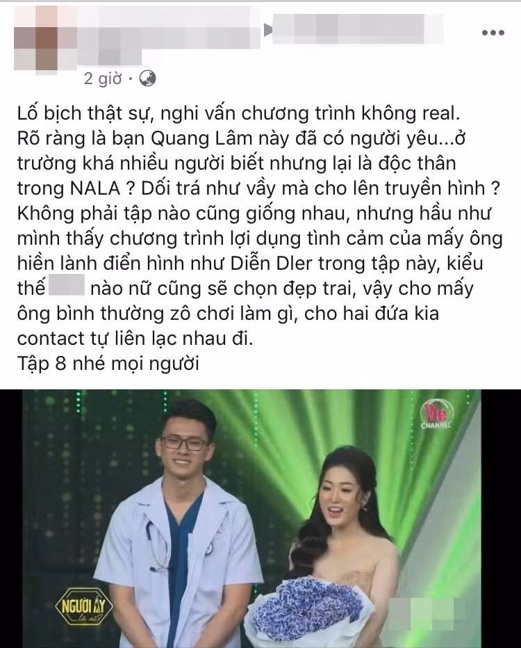 Trong thời gian qua, "Người Ấy Là Ai" liên tiếp dính nghi vấn xoay quanh các nam chính nói dối về công việc lẫn trạng thái tình cảm khi tham gia show khiến khán giả thất vọng. Hy vọng rằng, chàng bác sĩ Quang Lâm sẽ có câu trả lời sớm nhất cho khán giả về những tin đồn xung quanh ồn ào của mình.