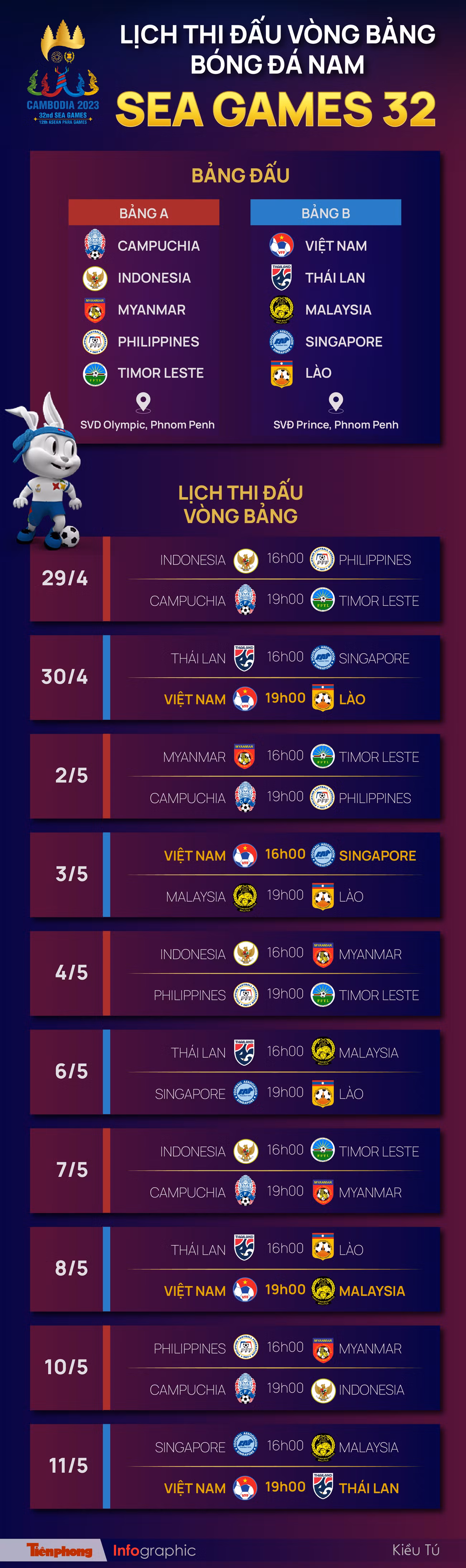 TPO - Vòng bảng SEA Games 32, U22 Việt Nam có 4 trận đấu ở bảng B, với các đối thủ là Thái lan, Singapore, Malaysia và Lào .