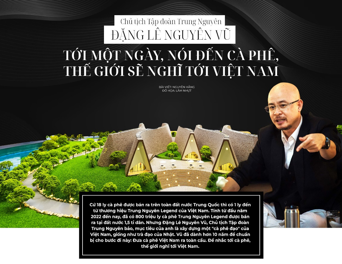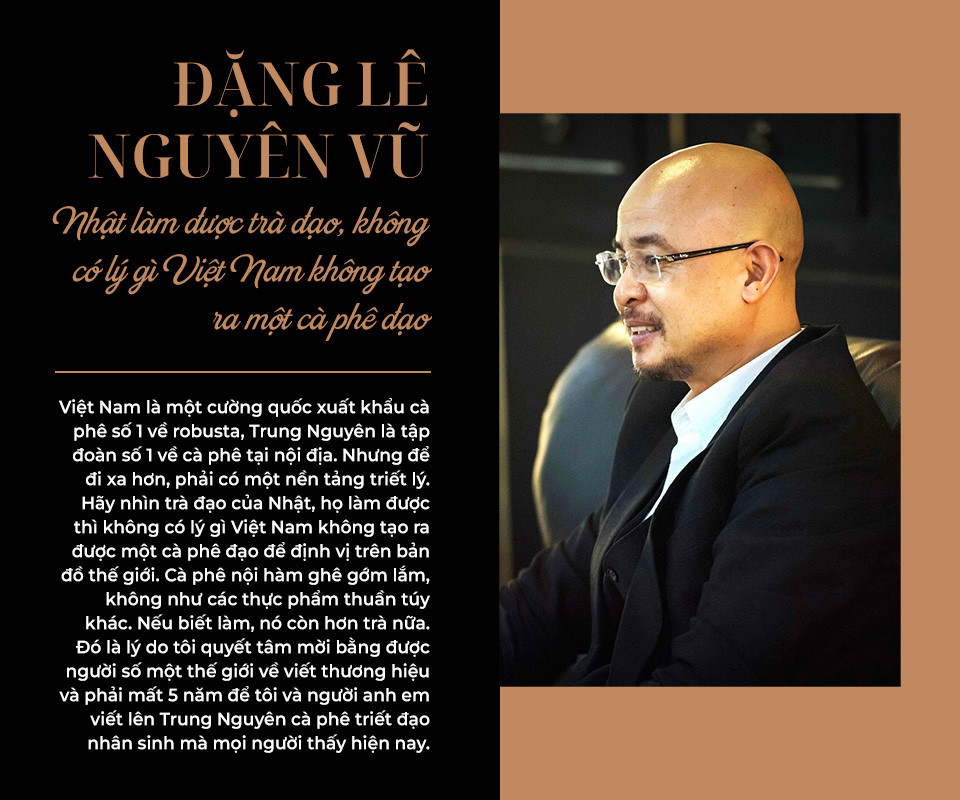 Nhưng Đặng Lê Nguyên Vũ, Chủ tịch Tập đoàn Trung Nguyên bảo, mục tiêu của anh là xây dựng một “cà phê đạo” của Việt Nam, giống như trà đạo của Nhật. Vũ đã dành hơn 10 năm để chuẩn bị cho bước đi này: Đưa cà phê Việt Nam ra toàn cầu. Để nhắc tới cà phê, thế giới nghĩ tới Việt Nam.