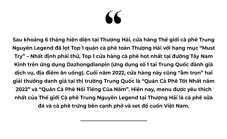 Thế nhưng Đặng Lê Nguyên Vũ, người được mệnh danh là "vua" cà phê Việt vẫn không hài lòng. Tháng 9.2022 đánh dấu một bước ngoặt mới của Trung Nguyên bằng việc khai trương không gian "Thế giới cà phê Trung Nguyên Legend" tại đường Tây Nam Kinh (Thượng Hải), con đường sầm uất, xa hoa nhất ở Trung Quốc.