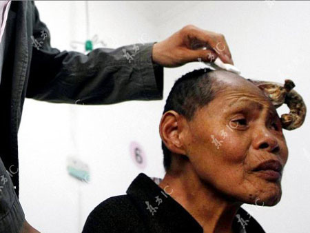Một người phụ nữ đến từ làng Zhanggang, thành phố Đăng Châu, tỉnh miền trung Hà Nam, Trung Quốc chuẩn bị phẫu thuật cắt bỏ chiếc sừng trên đầu.