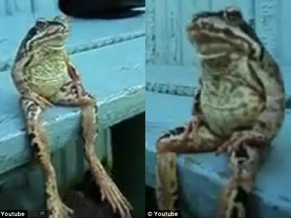 Chú ếch trong video ngồi thẳng người trên một băng ghế dài, hai chân buông thõng lủng lẳng, rất giống tư thế của con người khi đang ngồi chơi hay thư giãn.