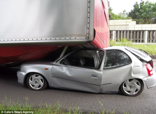 Tài xế xe con hiệu Nissan là một phụ nữ 20 tuổi đã may mắn thoát chết trong đường tơ kẻ tóc. Lúc chợt thấy chiếc xe tải bắt đầu lật nhào lên xe của mình, người phụ nữ này thật nhanh trí thả tay lái, tháo bỏ dây an toàn rồi trườn sang ghế trước bên cạnh.