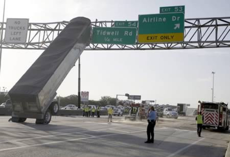 | Một tai nạn hiếm có xảy ra ở New York hồi tháng 8/2011 khi một công nhân mất điều khiển với chiếc xe tải chở rác và để xe lao qua tầng 3 của một khu nhà rồi cuối cùng “ngự” lơ lửng trên không, với phần lớn thân xe đã ở bên ngoài. Để xử lý tình huống trớ trêu này, các công nhân sau đó phải dùng cần cẩu tháo phần thân trước của chiếc xe, còn phần thân sau được kéo từ từ vào trong. |