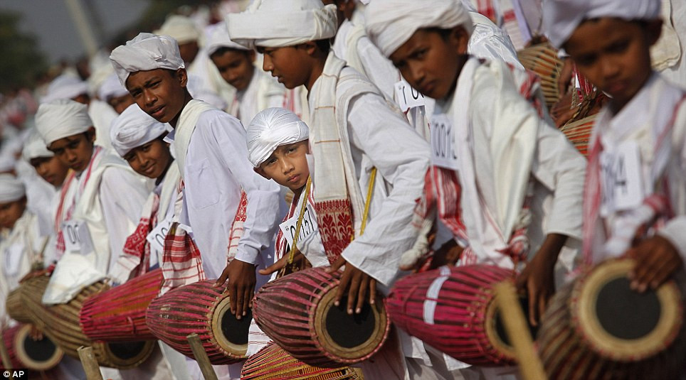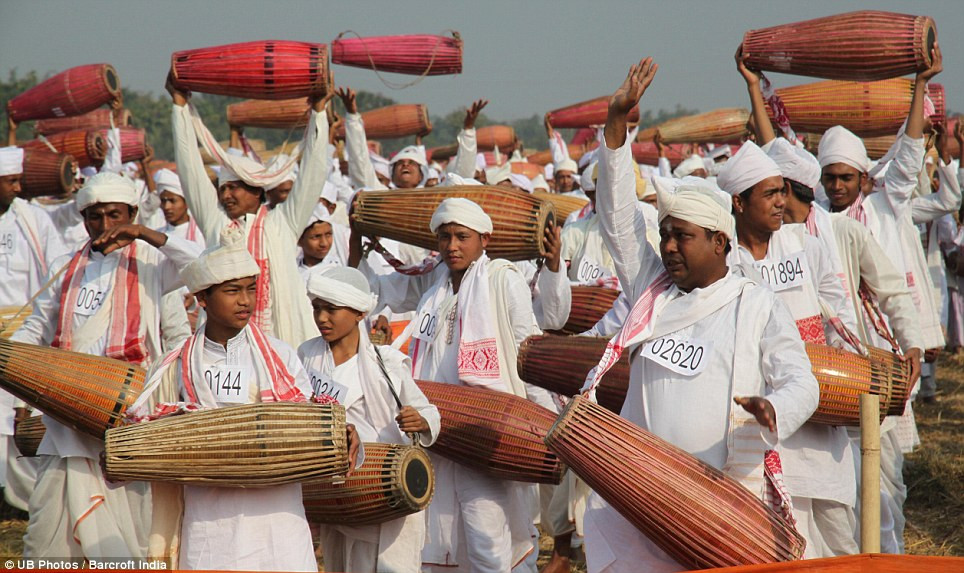Chính xác là 14.833 người trong trang phục áo trắng, đầu vấn khăn, tham gia đánh trống tại tỉnh Gauhati, phía đông Ấn Độ.
