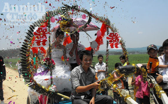| Cô dâu và chú rể hạnh phúc trên chiếc xe hoa là chiếc xe công nông càng tự chế được trang trí rất đẹp mắt. |