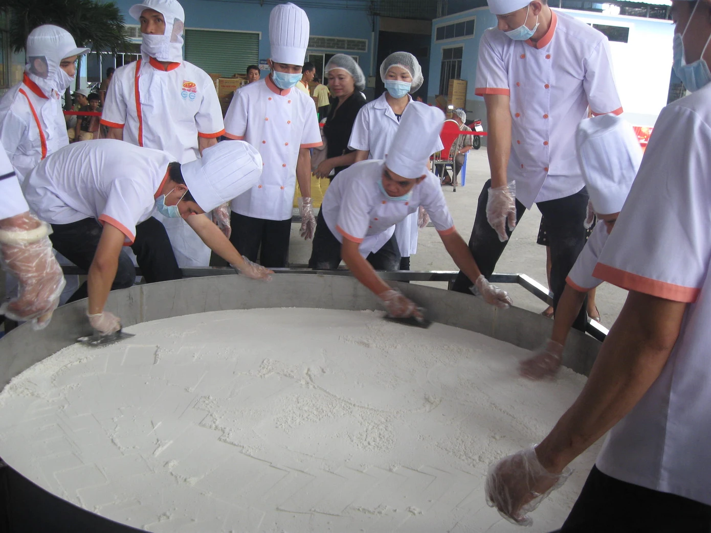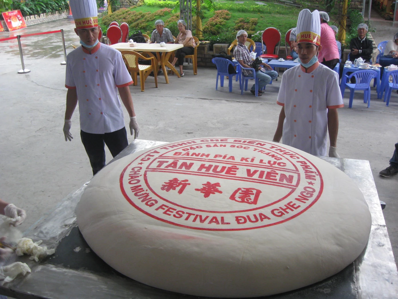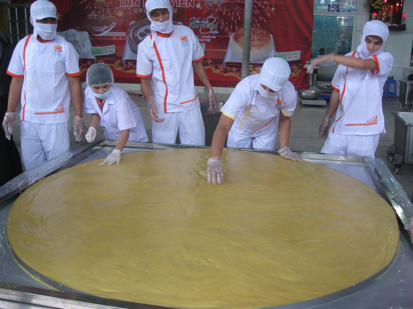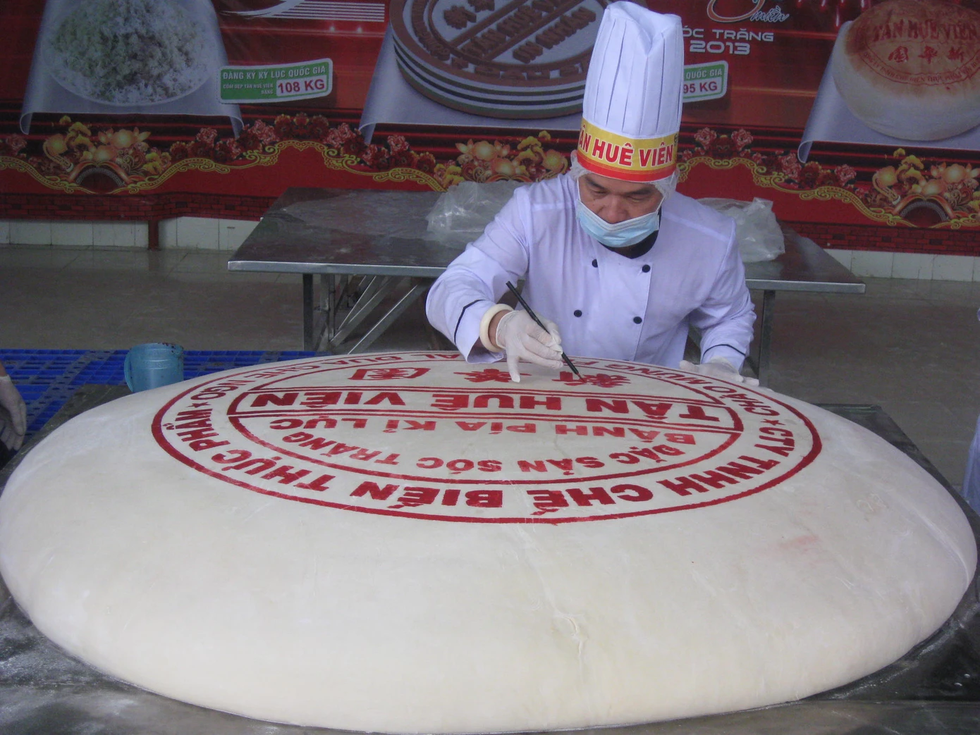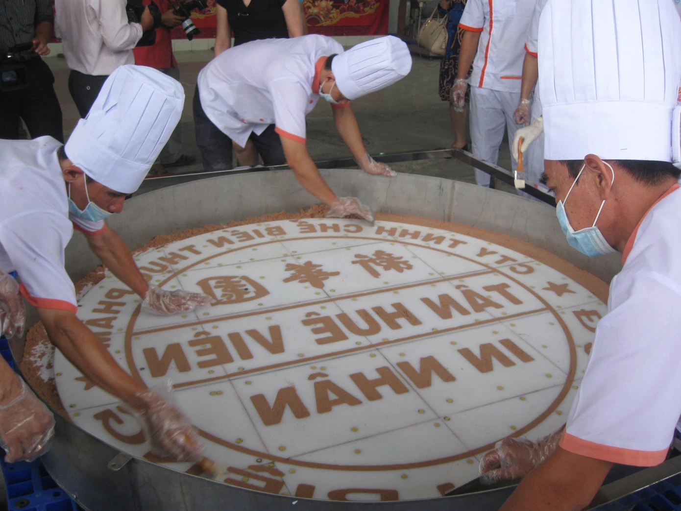 Công ty Tân Huê Viên còn sản xuất chiếc bánh In nhân đường kính 2m, dày 22cm, nặng 595kg và đĩa cốm dẹp nặng 106kg.