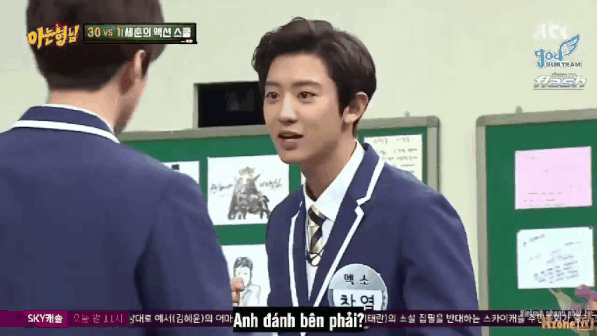 Cảnh quay này tất nhiên khiến khán giả vô cùng phấn khích, khi nhìn Sehun hóa thành cao thủ võ lâm tả xung hữu đột giữa kẻ thù. Nhưng mới đây, hậu trường cảnh hành động này được tiết lộ, khiến EXO-L cười ra nước mắt. Đó là khi nhóm EXO tham gia show giải trí Knowing Brothers, và Chanyeol tiết lộ cách Sehun tập luyện cho cảnh hành động.