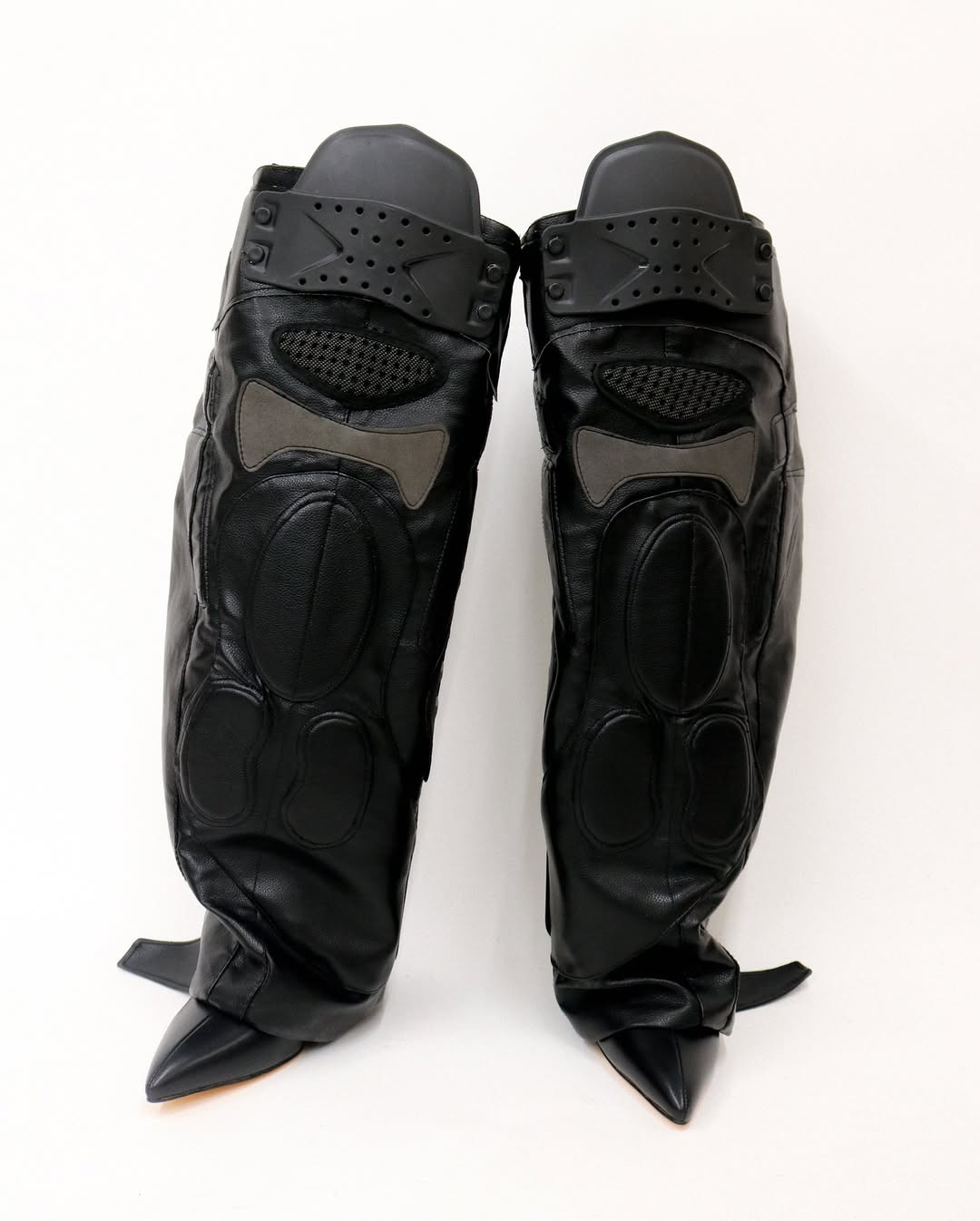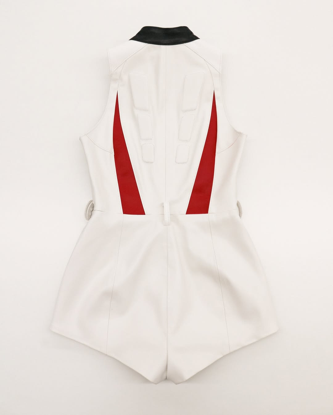 Toàn bộ outfit từ bodysuit, áo khoác da cho đến bốt bảo hộ đều là thiết kế tùy chỉnh, mang đậm phong cách racing (đua xe) cá tính. Theo chia sẻ từ nhà mốt, họ sử dụng các vật liệu bền vững như giấy Hanji truyền thống của Hàn Quốc, da thực vật làm từ táo hay vải tồn kho trong quá trình chế tác. Bộ cánh được tạo ra từ kỹ thuật không rác thải (zero-waste) nhận về lời khen từ giới chuyên môn.