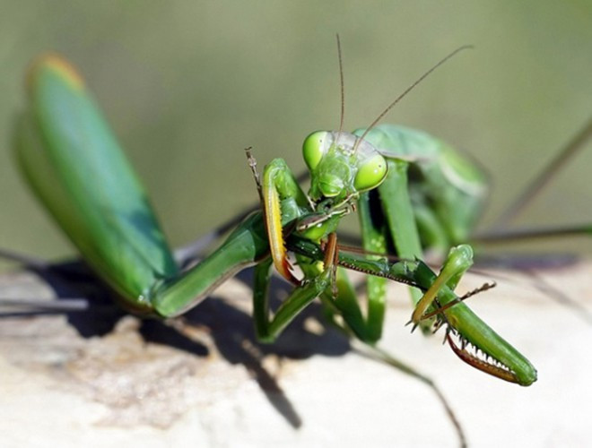 Bọ ngựa: Liệu bạn có bao giờ thắc mắc, tại sao bọ ngựa đực luôn phải chạy trốn sau khi giao phối? Lý do đơn giản là chúng không muốn bị bạn tình của mình nhai mất đầu. Thông thường, bọ ngựa cái sẽ ăn thịt bạn tình của mình để có được nguồn dinh dưỡng dồi dào cho quá trình "mang nặng đẻ đau" sau này. Điều này đồng nghĩa với việc, bọ ngựa đực gần như chỉ có thể giao phối một lần duy nhất trong đời. Mặc dù bị ăn mất phần đầu, bọ ngựa đực vẫn có thể thực hiện việc giao phối. Những hạch thần kinh vùng bụng của chúng có thể sống thêm vài giờ sau khi mất não và có thể độc lập điều khiển quá trình giao phối.