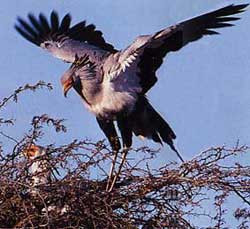Cảnh chim Sagittarius serpentarius bắt rắn cũng rất kỳ lạ: Nó tóm lấy con rắn bằng những móng chân chắc khỏe và đập đầu con rắn cho đến chết, đồng thời tự bảo vệ mình khỏi bị cắn bằng đôi cánh to lớn đầy lông. Cũng có khi nó chộp con rắn và tung con rắn lên cao nhiều lần khiến cho con mồi bất tỉnh. Nó biết kiểm tra con rắn cẩn thận trước khi nuốt. Ở Nam Phi, người ta thường nuôi loại chim này để giết rắn và chuột.