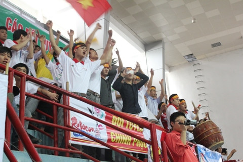 Rất nhiều bạn trẻ đã đến cổ vũ. Tiếng trống, tiếng hò hét tên đội yêu thích, cùng băng rôn và cờ tổ quốc đốt cháy nhà thi đấu Quận Tây Hồ.