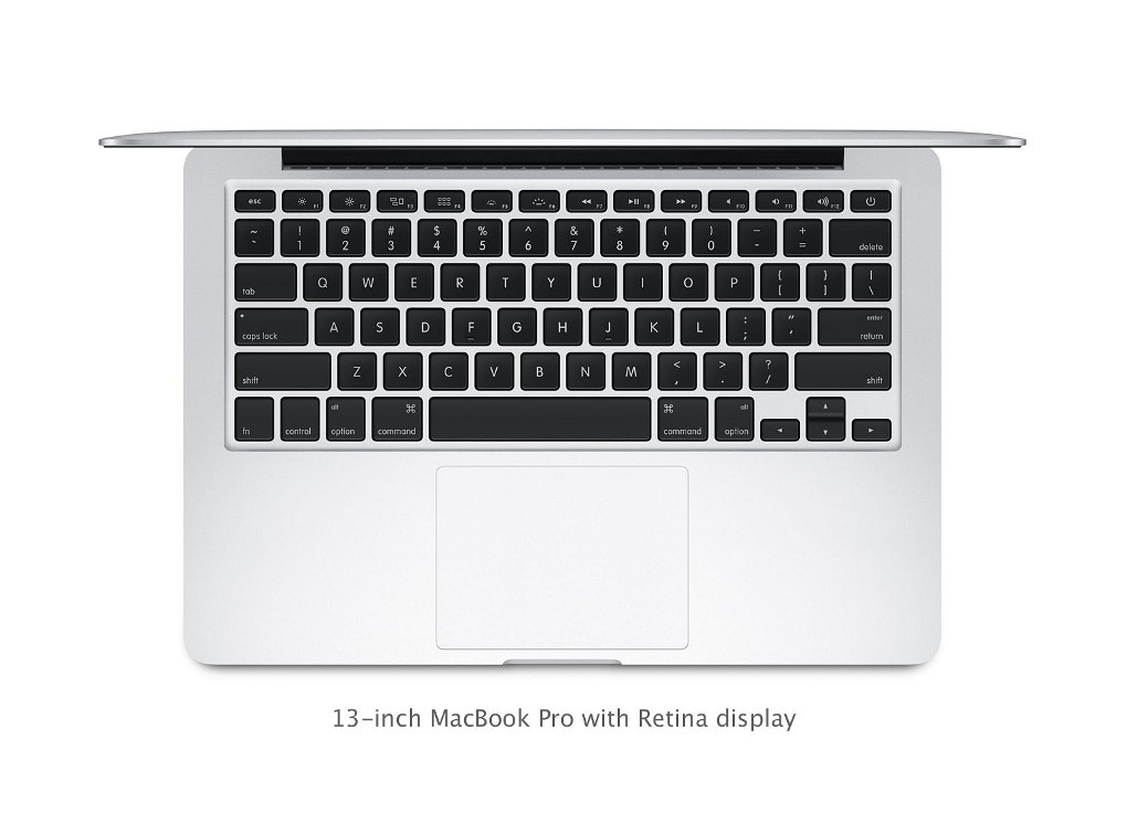 Bàn phím trên MacBook Pro Retina 13" vẫn giữ nguyên kích thước chuẩn của Apple, mặc dù loa ngoài được di chuyển từ hai bên cạnh lên phía trên bàn phím.