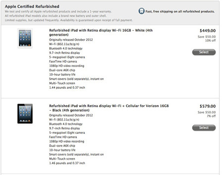 Khách hàng muốn tìm một chiếc iPad đúng cỡ (full-size) có thể chọn một bản tân trang của iPad 4, với bộ vi xử lý được nâng cấp và tương thích với chuẩn đầu sạc Lightning mới. Các phiên bản này có giá từ 449 USD cho bản 16GB Wi-Fi màu trắng, tới 679 USD cho bản màu đen 32GB Wi-Fi + Cellular.