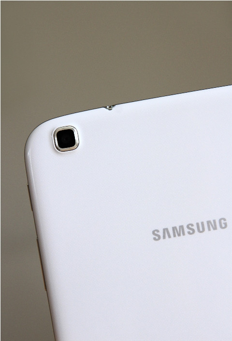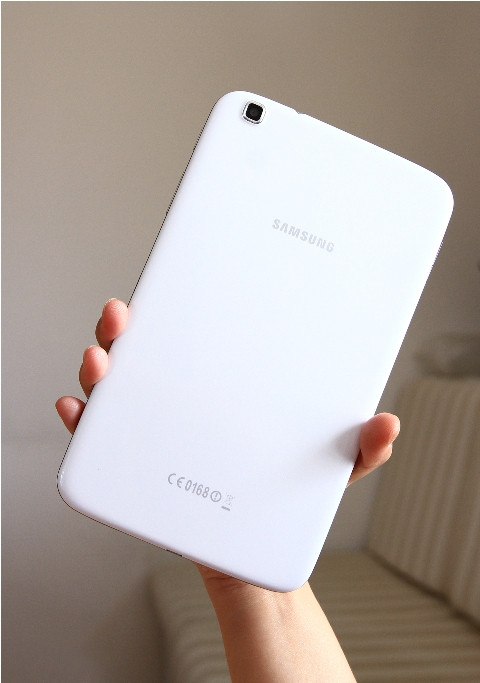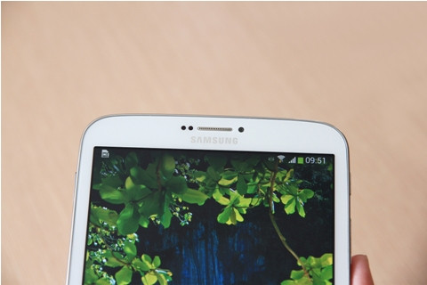 Mặt trước của Galaxy Tab 3 8-inch trông khá thanh thoát, viền màn hình hẹp so với một chiếc tablet, do đó diện tích dành để hiển thị rộng rãi. Màn hình 8 inch hỗ trợ độ phân giải 1280 x 800 pixel và mật độ điểm ảnh 189ppi. Mặt sau máy bọc bằng nhựa, họa tiết vân ô nhỏ, giúp chống trượt khi cầm trên tay.