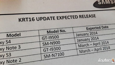 Galaxy Note 3 và Galaxy S4 sẽ được cập nhật lên hệ điều hành Android 4.4 KitKat vào tháng 1/2014. Galaxy Note II và Galaxy S III muộn hơn, vào tháng 3 hoặc tháng 4/2014.