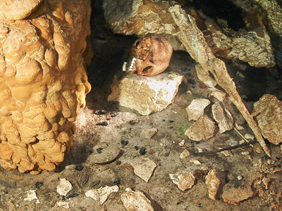 Hố chôn được tìm thấy có chuỗi hạt ngọc trai, một con dao, các loại dụng cụ bằng đá được xem là đồ dùng của người Maya. Trong sáu bộ xương chôn cùng những đồ này có hai bộ xương trẻ em. Toàn bộ được chôn dưới một hố sâu cách mặt đất 21m.
