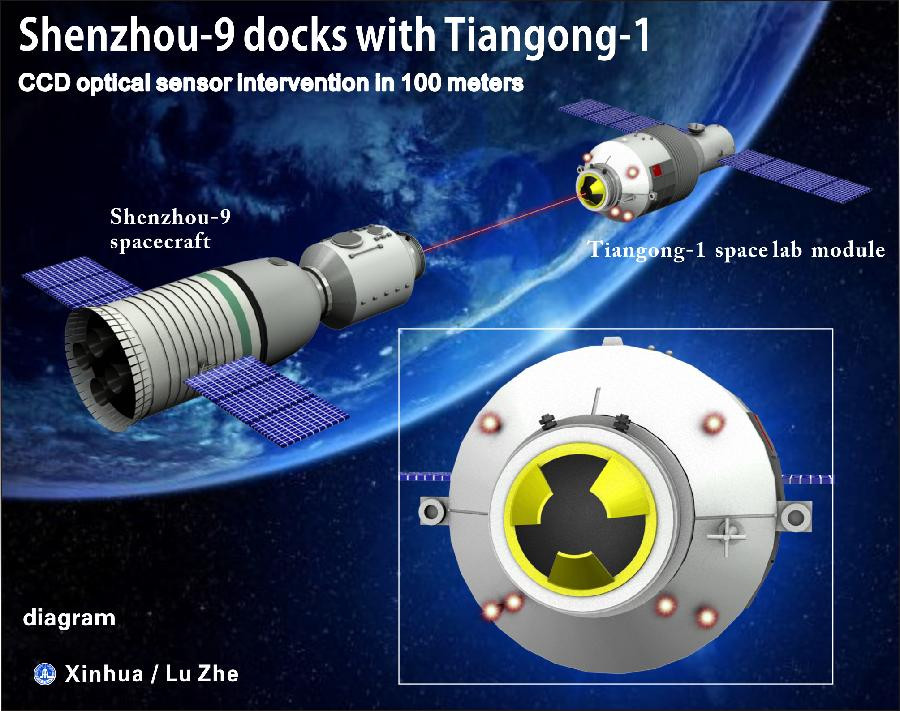 | Hình ảnh cận cảnh khi tàu vũ trụ Thần Châu 9 đi vào quỹ đạo trạm vũ trụ Thiên Cung 1. |