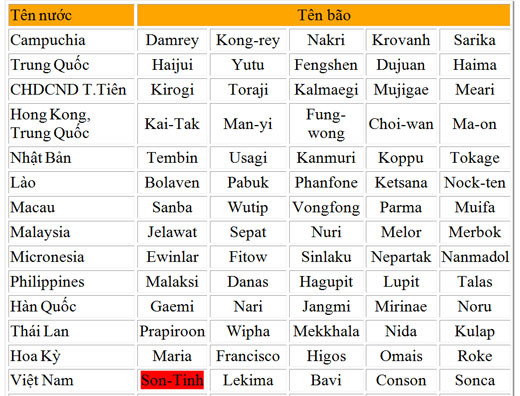 Trên thực tế, các nước đã lấy tên của các vị thần, các loài hoa, con thú quý hiếm, địa danh nổi tiếng, thậm chí là các món ăn… để đề cử cho Ủy ban bão của khu vực.