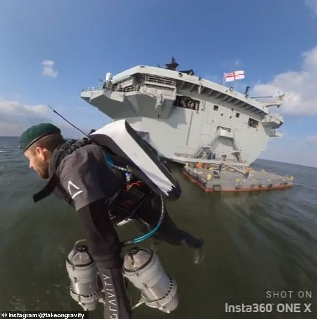 Tài khoản Twitter chuyên cập nhật thông tin của HMS Queen Elizabeth hôm 21/11 đã đăng tải một đoạn video ghi lại chuyến bay xung quanh con tàu của anh Browning, người sáng chế ra bộ trang bị có thể giúp người bình thường bay lượn như chim.