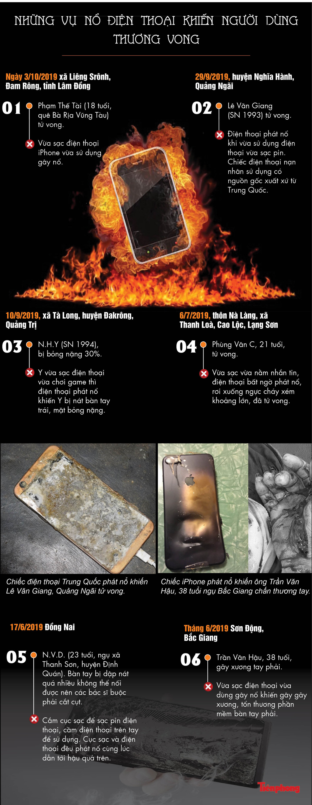 TPO - Gần đây, hàng loat vụ nổ điện thoại khi đang sử dụng khiến người dùng tử vong hay bị thương nặng liên tục xảy ra. Điện thoại phát nổ trong lúc sạc có thể xảy ra với smartphone của bất kỳ hãng nào.