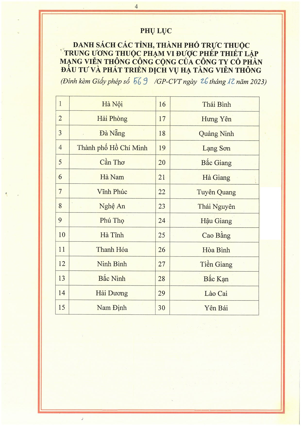 3. Phạm vi thiết lập mạng: Doanh nghiệp được phép thiết lập mạng viễn thông công cộng trong phạm vi khu vực 30 tỉnh, thành phố trực thuộc Trung ương ( Danh sách các tỉnh, thành phố trực thuộc Trung ương tại Phụ lục của giấy phép này ).