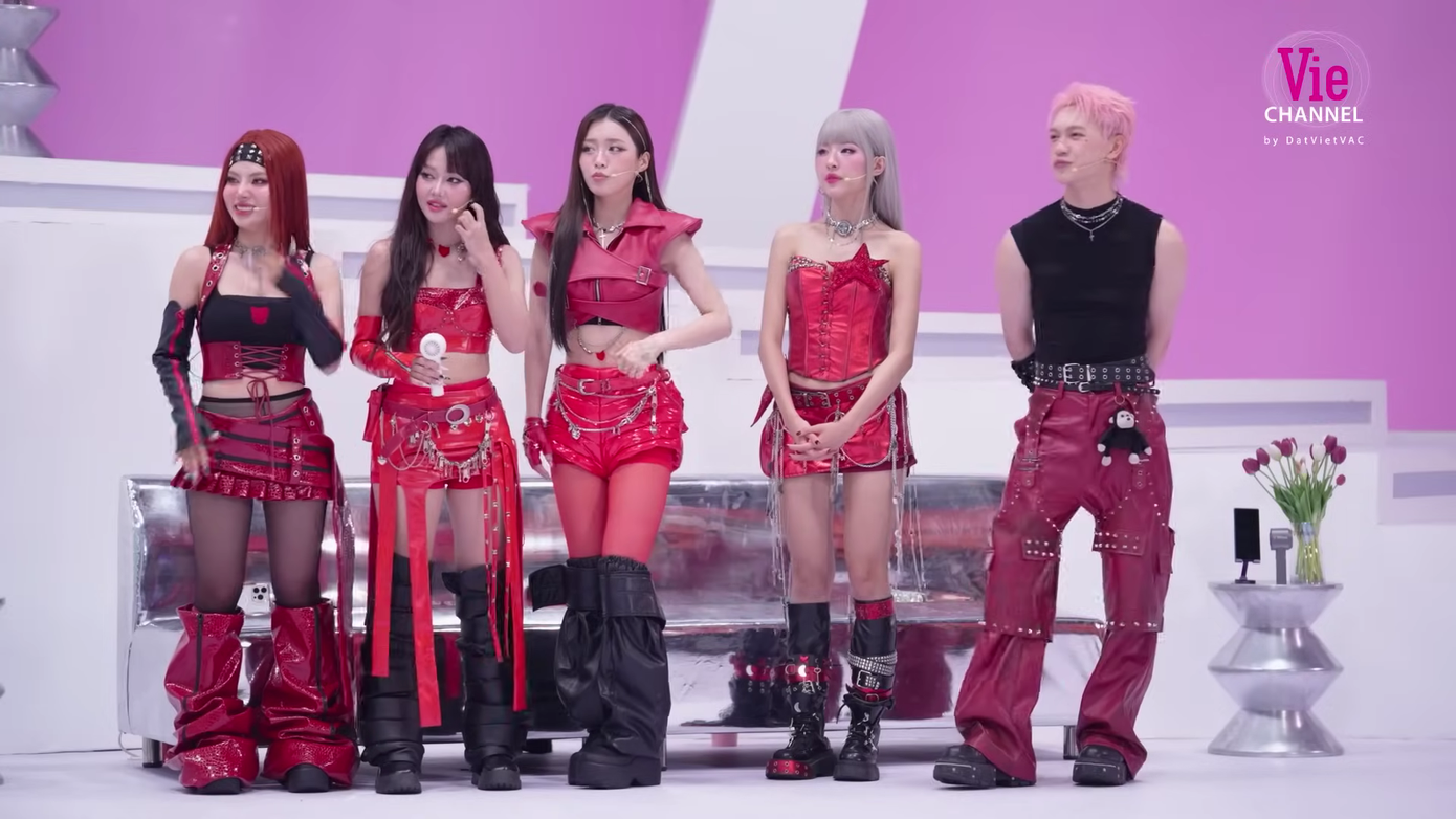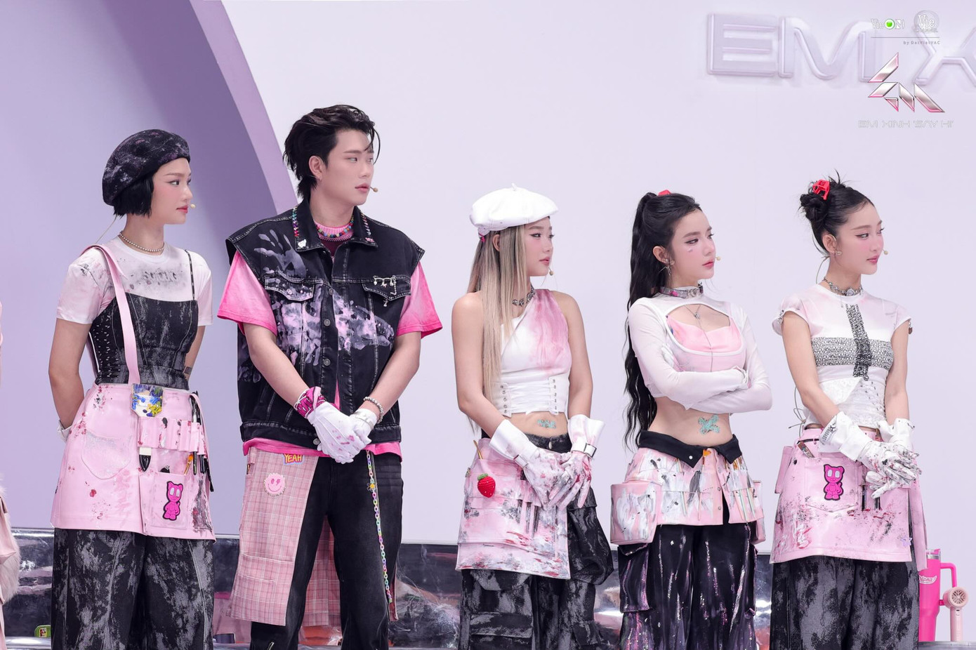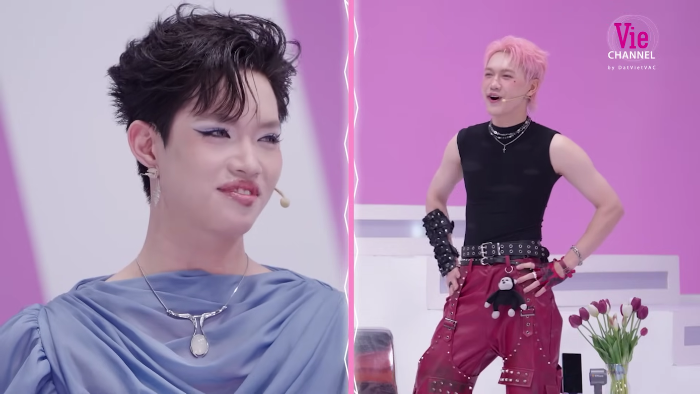 Dương DomicGemini Hùng Huỳnh diện trang phục hắc - hồng tone sur tone cùng dàn "em xinh" đội Miu Lê. Bộ đôi nghệ sĩ Gen Z "sai đẹp chiêu" trong trang phục phong cách đường phố bụi bặm, phối phụ kiện "kẹo ngọt".