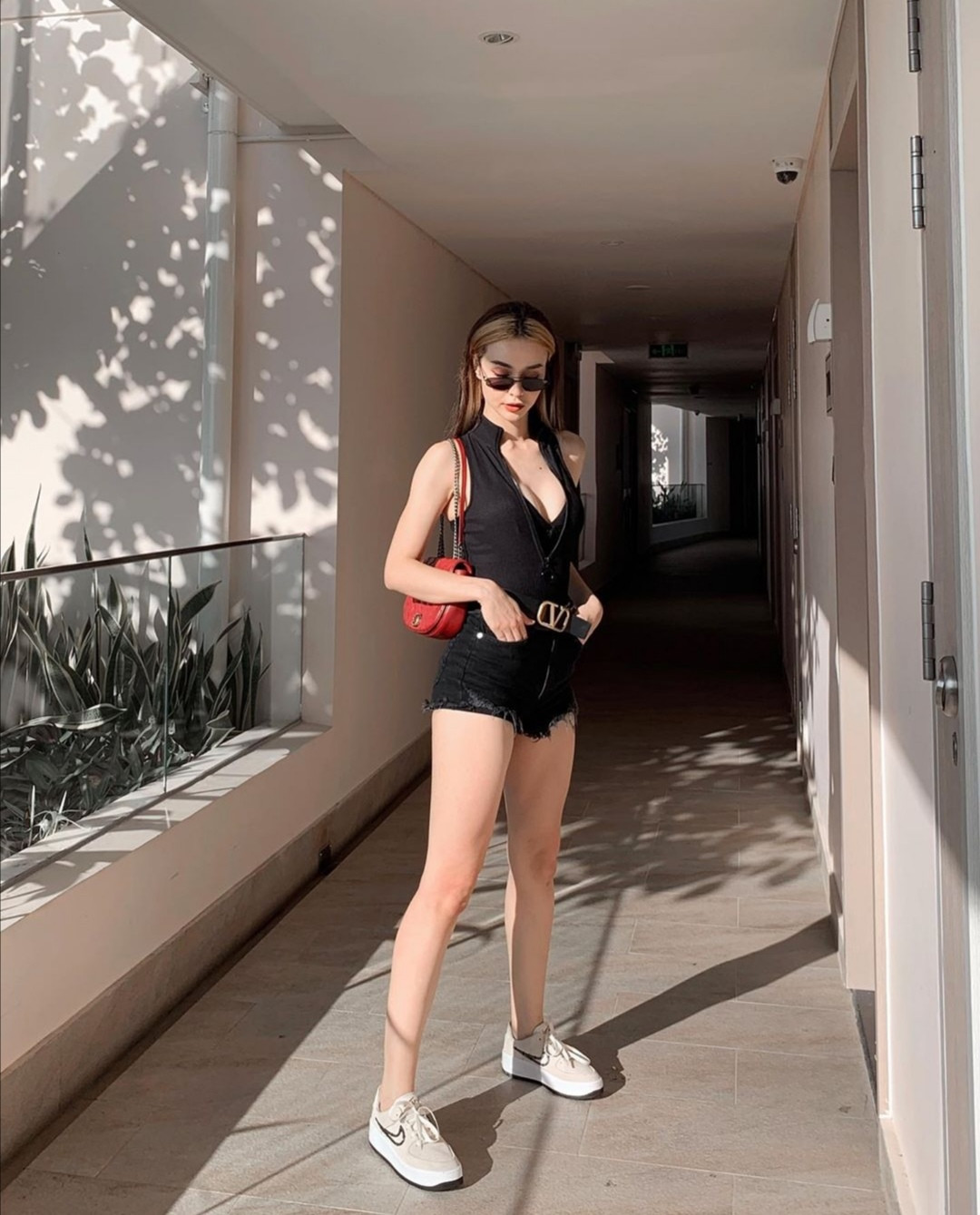 MLee ra phố cực sành điệu với một chiếc áo màu đen xẻ ngực quyến rũ mix cùng quần soóc tua rua, đi kèm phụ kiện mắt kính, thắt lưng da và túi xách hàng hiệu.