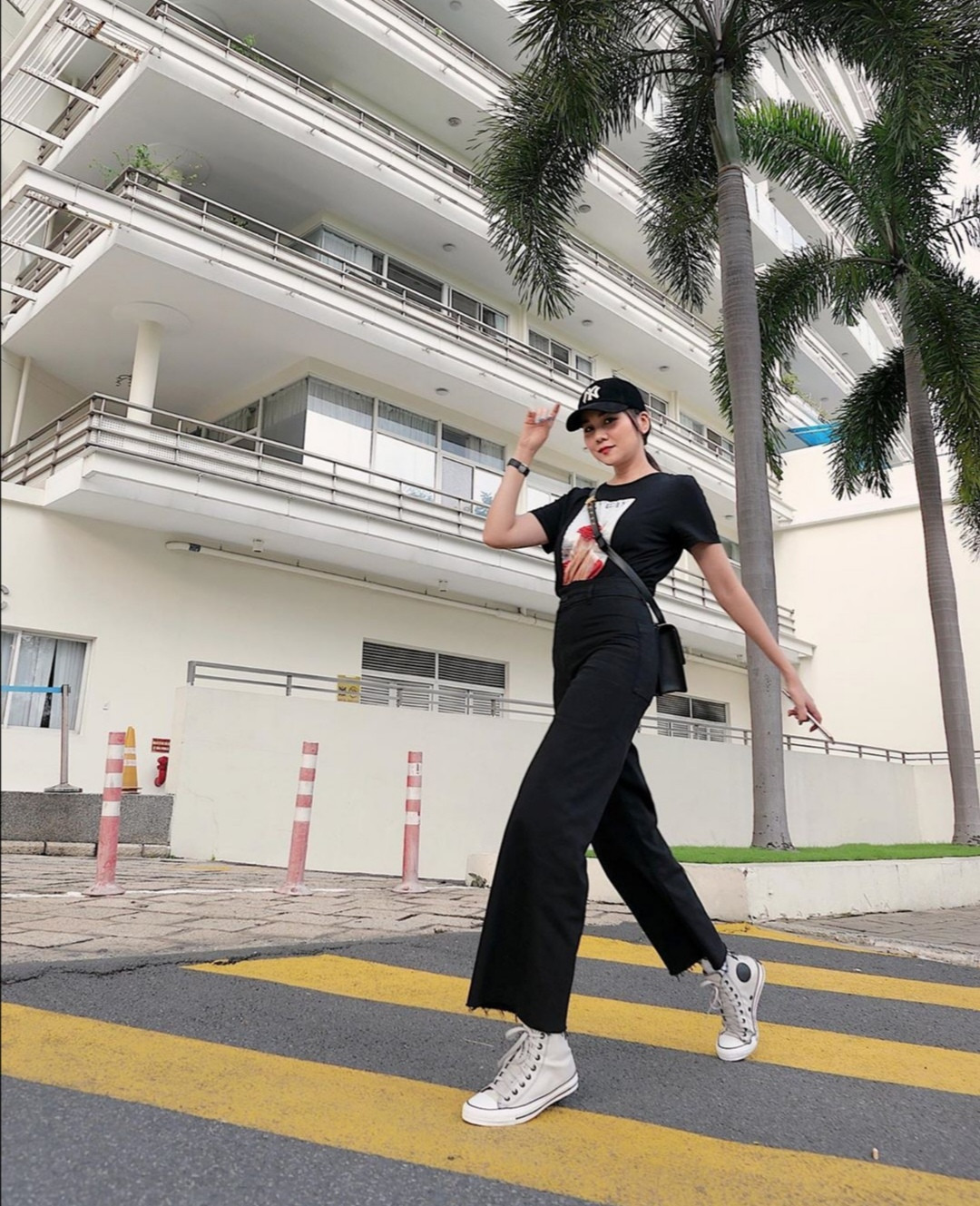 Thanh Hằng mặc cả cây đen nhưng vẫn trẻ trung bất ngờ, cô chọn áo phông in hình mix cùng quần ống rộng thời trang, nàng siêu mẫu còn chọn thêm một chiếc mũ lưỡi trai mát mẻ và đôi giày Converse cao cổ năng động.
