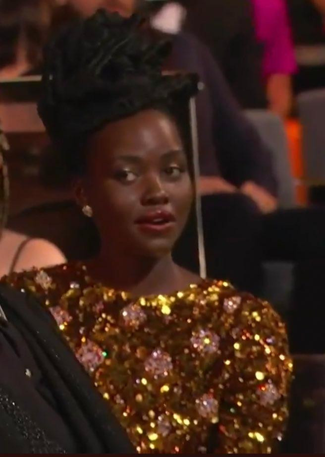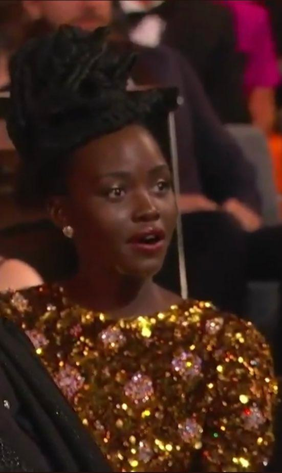Ngồi ngay sau vợ chồng nam tài tử Will Smith, ngôi sao Marvel Lupita Nyong'o đã bị ống kính máy quay bắt trọn khoảnh khắc gượng gạo trong suốt quá trình Will Smith "đi đường quyền".
