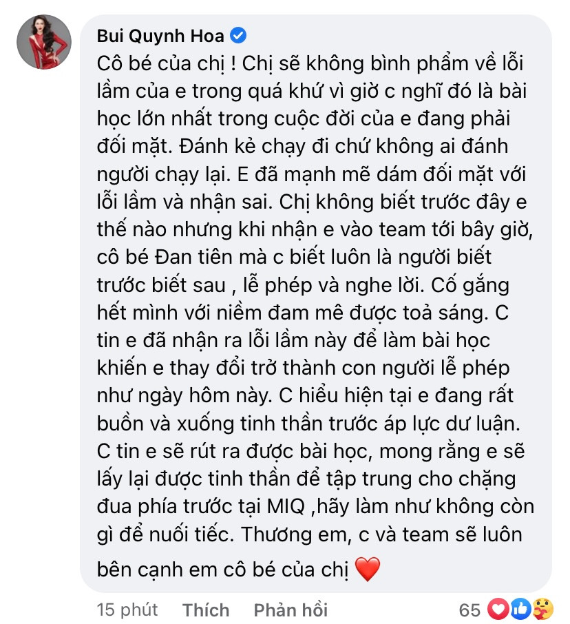 Về phía HLV Quỳnh Hoa, cô cũng để lại một bình luận dài dưới bài viết của học trò. Quỳnh Hoa viết: "...Đánh kẻ chạy đi chứ không ai đánh người chạy lại. Em đã mạnh mẽ dám đối mặt với lỗi lầm và nhận sai. Chị không biết trước đây em thế nào nhưng khi nhận em vào team tới bây giờ, cô bé Đan Tiên mà chị biết luôn là người biết trước biết sau, lễ phép và nghe lời. Cố gắng hết mình với niềm đam mê được tỏa sáng".