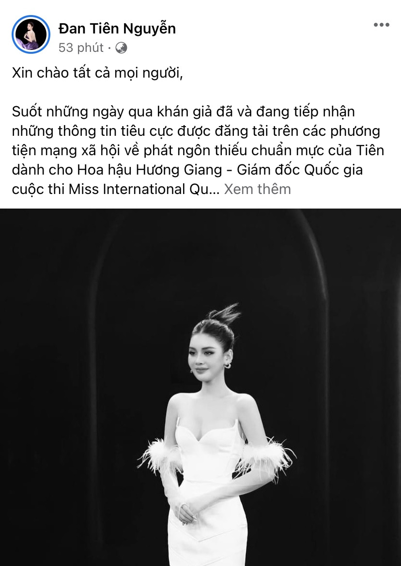 Khuya ngày 25/3, Đan Tiên đã đăng tâm thư xin lỗi về phát ngôn thiếu chuẩn mực của mình dành cho Hoa hậu Hương Giang. Cô chia sẻ: "Từ tận đáy lòng, Đan Tiên cảm thấy rất xấu hổ với chính bản thân mình và chị Hương Giang. Đan Tiên sẽ không biện minh gì thêm cho những hành động sai trái của mình trong quá khứ. Đan Tiên hiểu điều đó thật khó mà chấp nhận được đối với một người đang mong muốn được hoạt động nghệ thuật một cách chân chính.