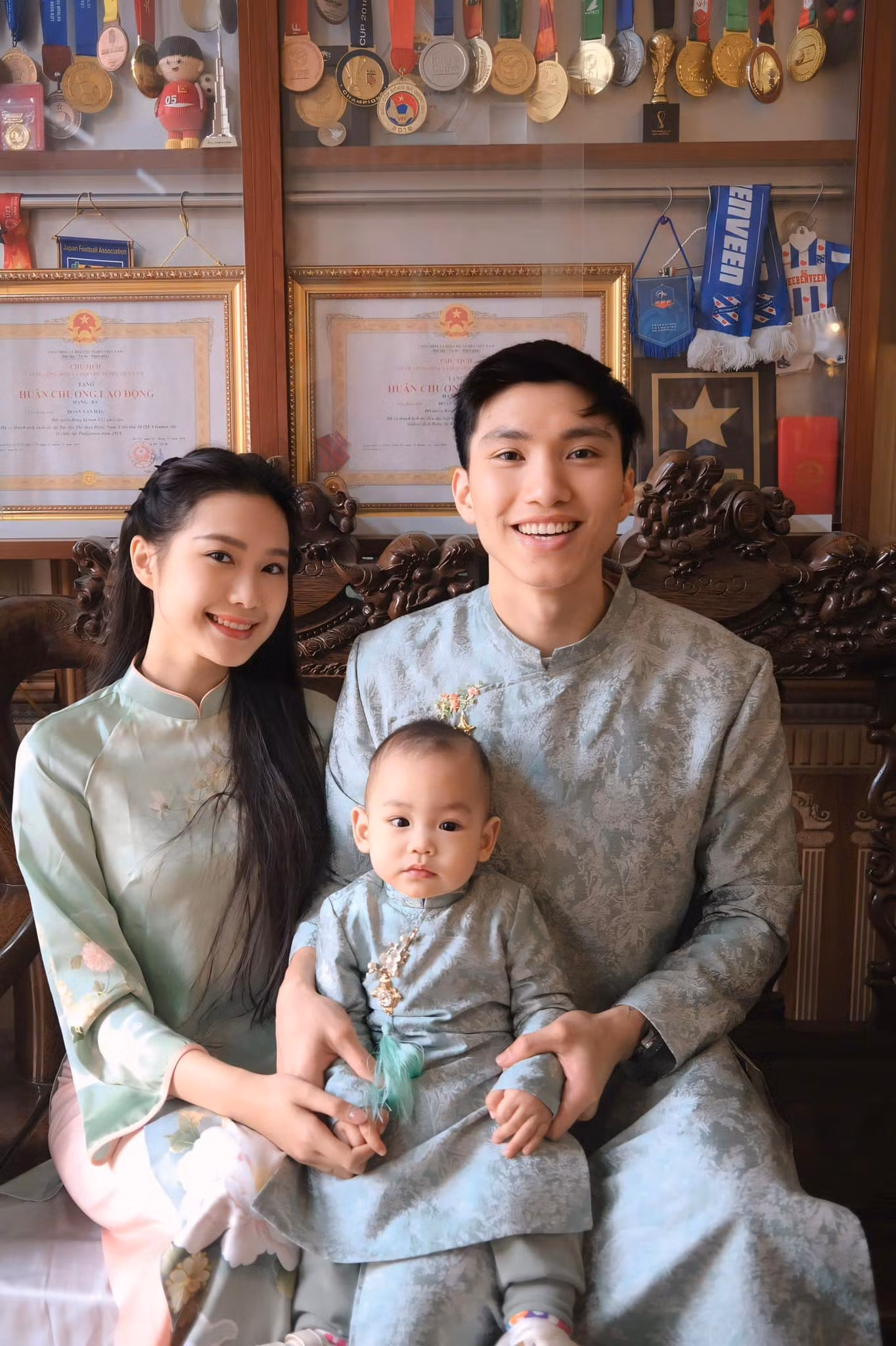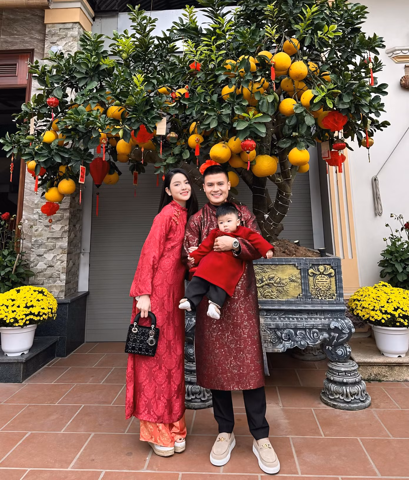 | Gia đình nhỏ của đội trưởng Duy Mạnh chụp hình ngày Tết. "Công chúa béo" Quỳnh Anh mặc trang phục giản dị, tươi tắn bên chồng và các con. |