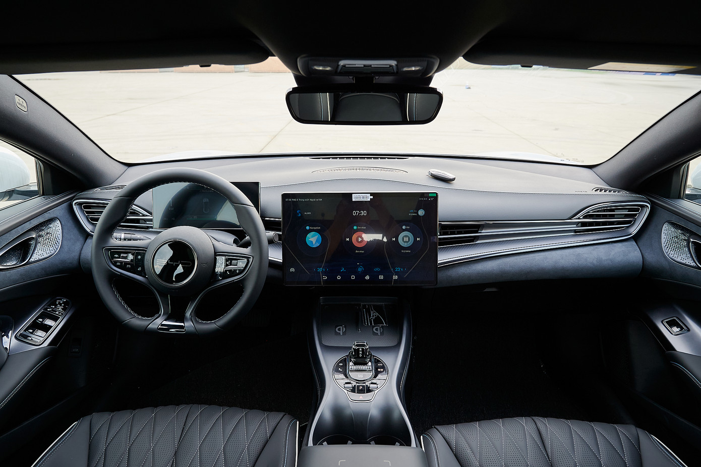 Trong khi đó, mẫu xe điện của Trung Quốc có thiết kế dạng coupe với phần mui được vuốt mềm mại về phía sau. Xe được trang bị hệ thống đèn chiếu sáng dạng full LED, đèn pha kiểu dáng cá tính, cụm đèn hậu thiết kế mỏng nối liền nhau, tay nắm cửa đặt ẩn, bộ lốp 19 inch.