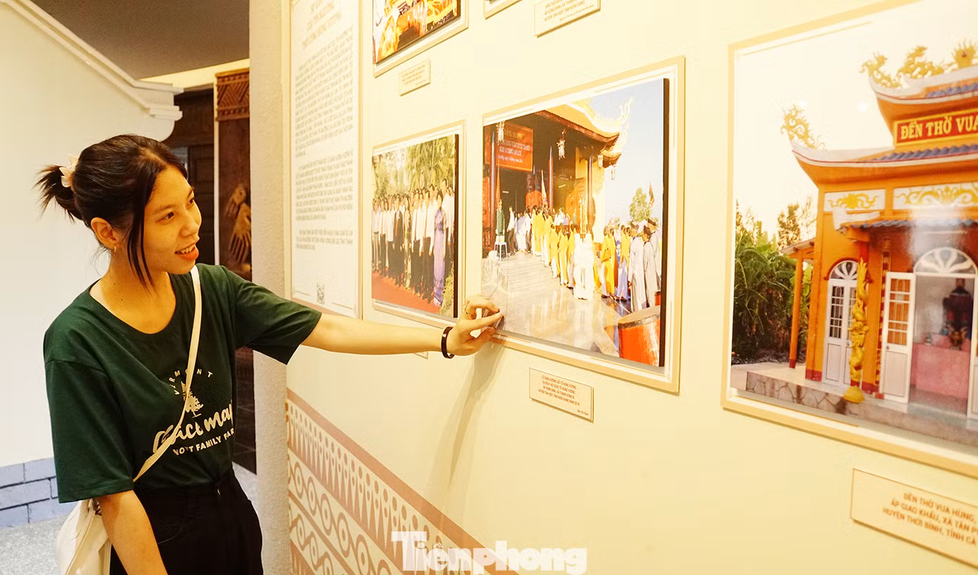 | Người dân tham quan tư liệu tại nhà trưng bày ở đền thờ Vua Hùng. |