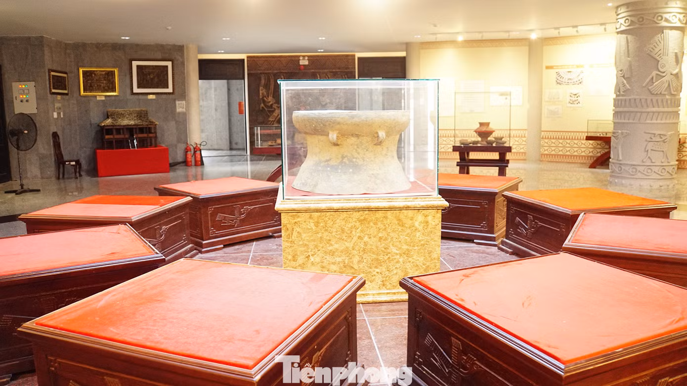 | Trống đồng trưng bày tại nhà lưu niệm của đền thờ. Ảnh: Hòa Hội |