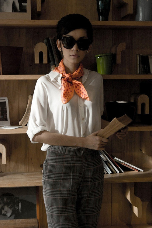 Xuân Lan hóa thân thành một cô nàng của thập niên 50, 60. Mắt kính mèo với cạnh tròn khá phù hợp với khuôn mặt vuông hay mặt góc cạnh của cô nàng.