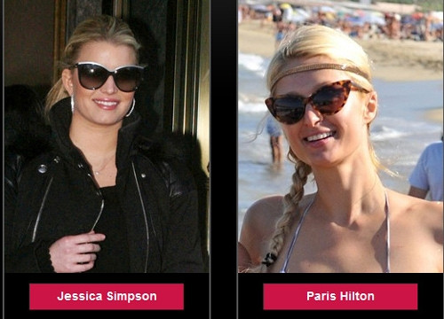 Kính mắt mèo điểm viền trắng của nàng béo Jessica Simpson trẻ trung và hài hòa với các đường nét trên khuôn mặt hơn hẳn Paris Hilton