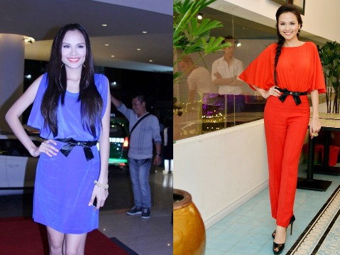 Diễm Hương thích thú với dải thắt lưng nơ màu đen. Cô kết hợp nó với chiếc đầm xanh nước biển và bộ jumpsuit đỏ rất ấn tượng