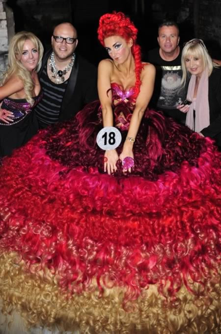 Thelma Madine và Ryan Edwards đã phải chi 200 bảng Anh để mua 250 m tóc người để may một chiếc váy. Hai nhà thiết kế may chiếc váy này cho một thí sinh tham gia một cuộc thi sắc đẹp tại Liverpool, Anh.