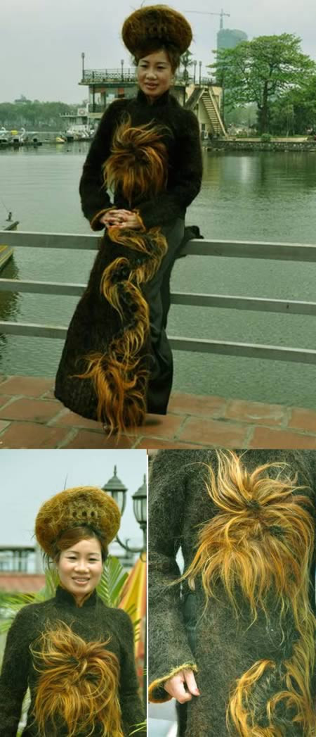 Chiếc áo dài độc và lạ này là sản phẩm của nhà tạo mẫu tóc Kim Đô. Chiếc áo dài này được làm từ tóc của 54 người trên khắp đất nước Việt Nam, trong đó còn có tóc của một số nghệ sĩ nổi tiếng như Hồng Nhung, Thanh Lam, Kiều Anh. Sau khi gom đủ tóc, bà Kim Đô đem chúng đi nhuộm và chỉ dùng một chiếc kim để may nó. Mặt trước của chiếc áo dài được thêu hình một con rồng. Chiếc mũ đội đầu cũng được làm từ tóc có hình ảnh tháp rùa.
