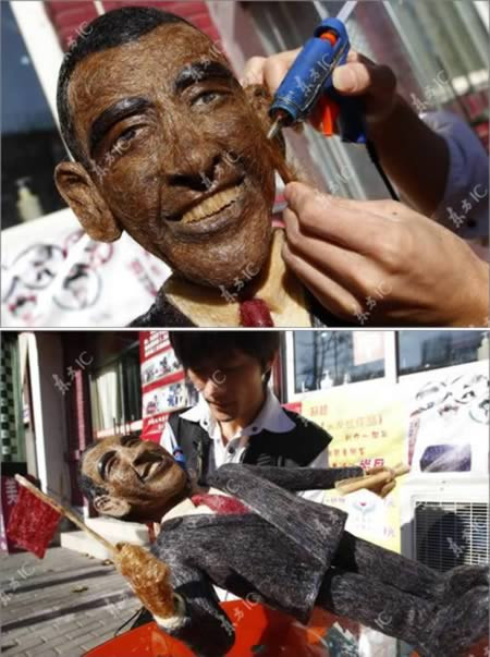 Để chào mừng Tổng thống Obama đến thăm Trung Quốc, Huang Xin và một số người khác đã cùng thực hiện lại chân dung Obama hoàn toàn từ tóc người. Những người này đã phải mất 4 ngày đêm và sử dụng tới 4kg tóc để hoàn thiện tác phẩm độc đáo này.