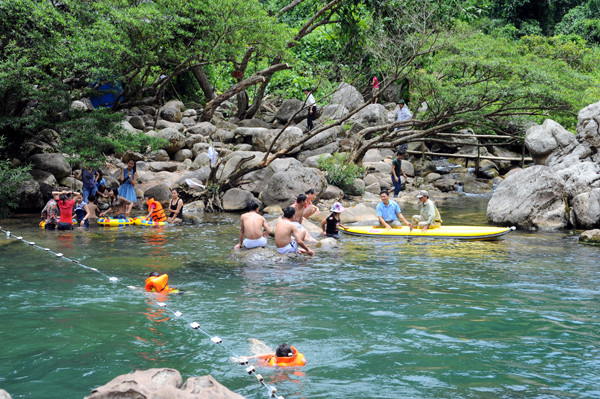 Du khách thư giãn và tận hưởng những giây phút thoải mái khi đắm mình trong dòng nước mát tuyệt vời của suối nước Moọc.