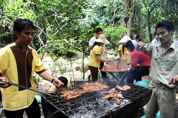 Dừng chân và thưởng thức những món ăn dân dã như tôm và thịt nướng