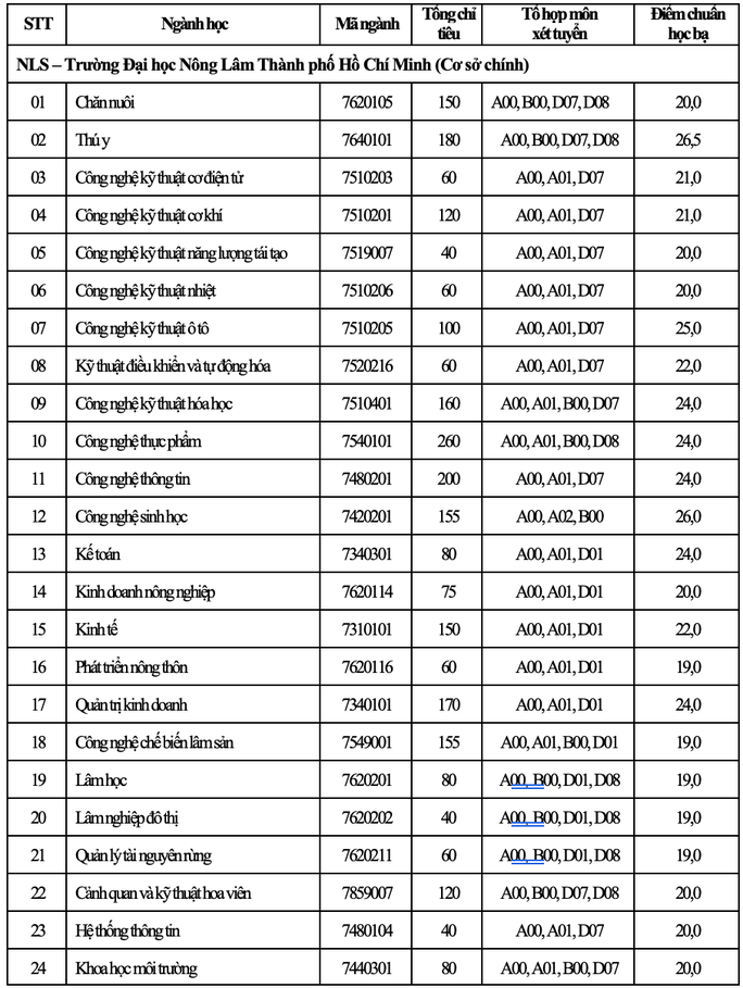 | Điểm chuẩn theo phương thức xét học bạ THPT vào trường ĐH Nông lâm TP.HCM. |
